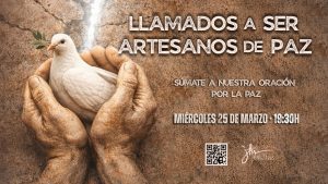 Desde la Compañía de Jesús nos queremos hacer eco de la invitación del Papa a rezar por la paz en este momento en el que se ve amenazada en tantos lugares de nuestro mundo. Os invitamos a participar en una oración online bajo el lema: Llamados a ser artesanos de paz. Será el miércoles 25 de marzo a las 19.30 en este enlace. Puedes unirte también a través del QR de la imagen.